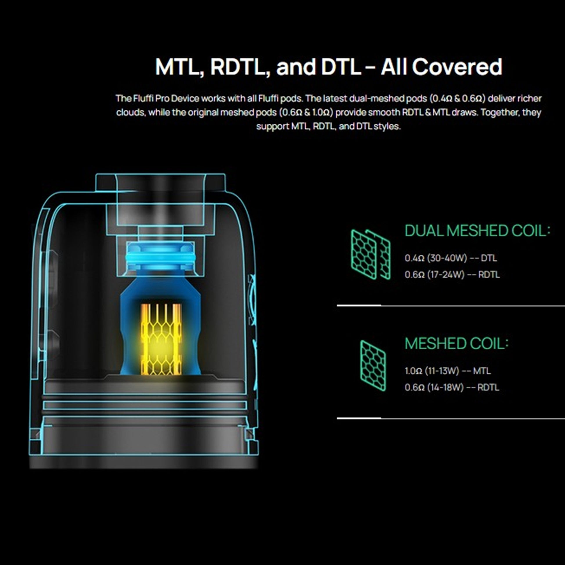 La nouvelle résistance double mesh 0.4Ω garantit une vapeur dense et un rendu saveur optimal, parfaitement compatible avec le Fluffi Pro.