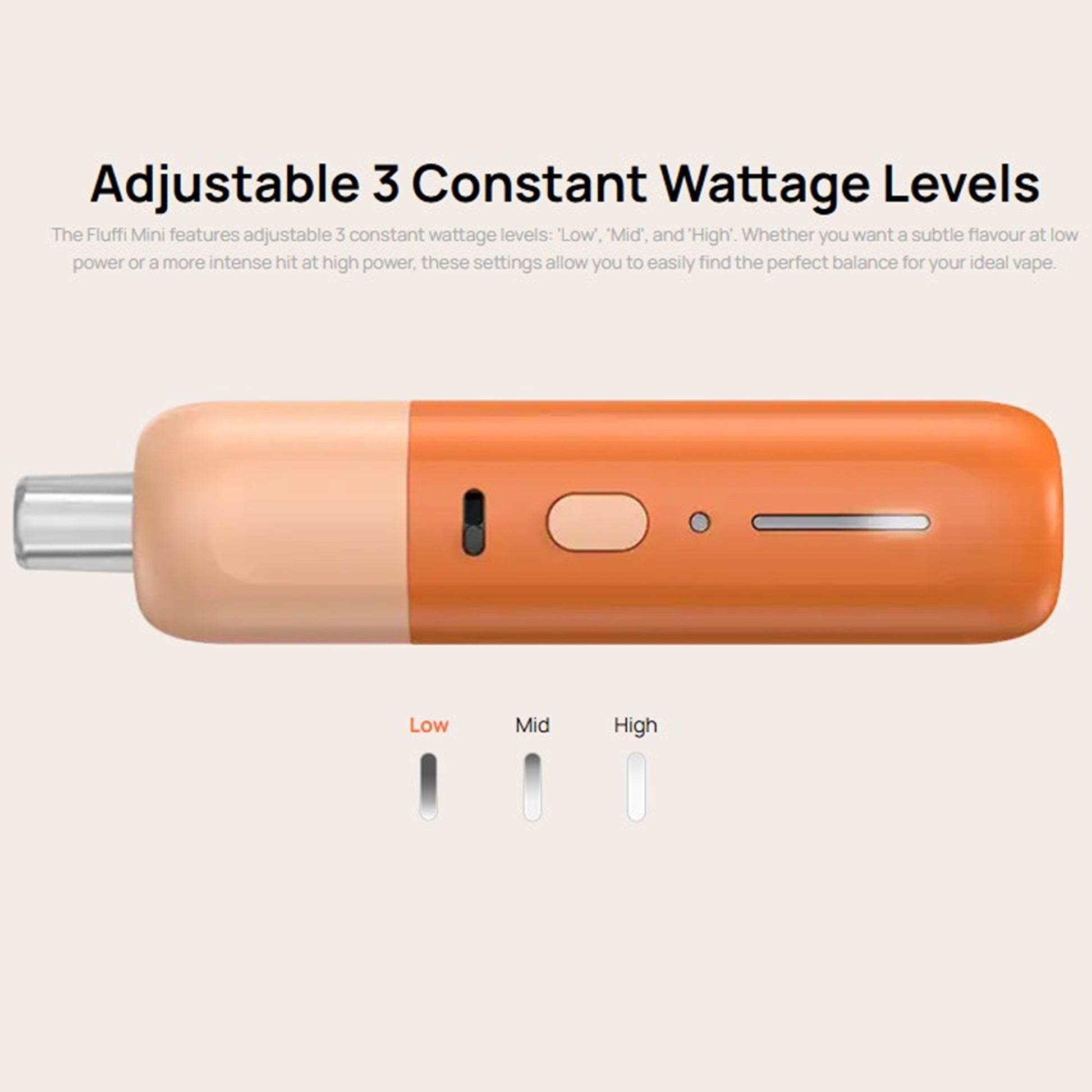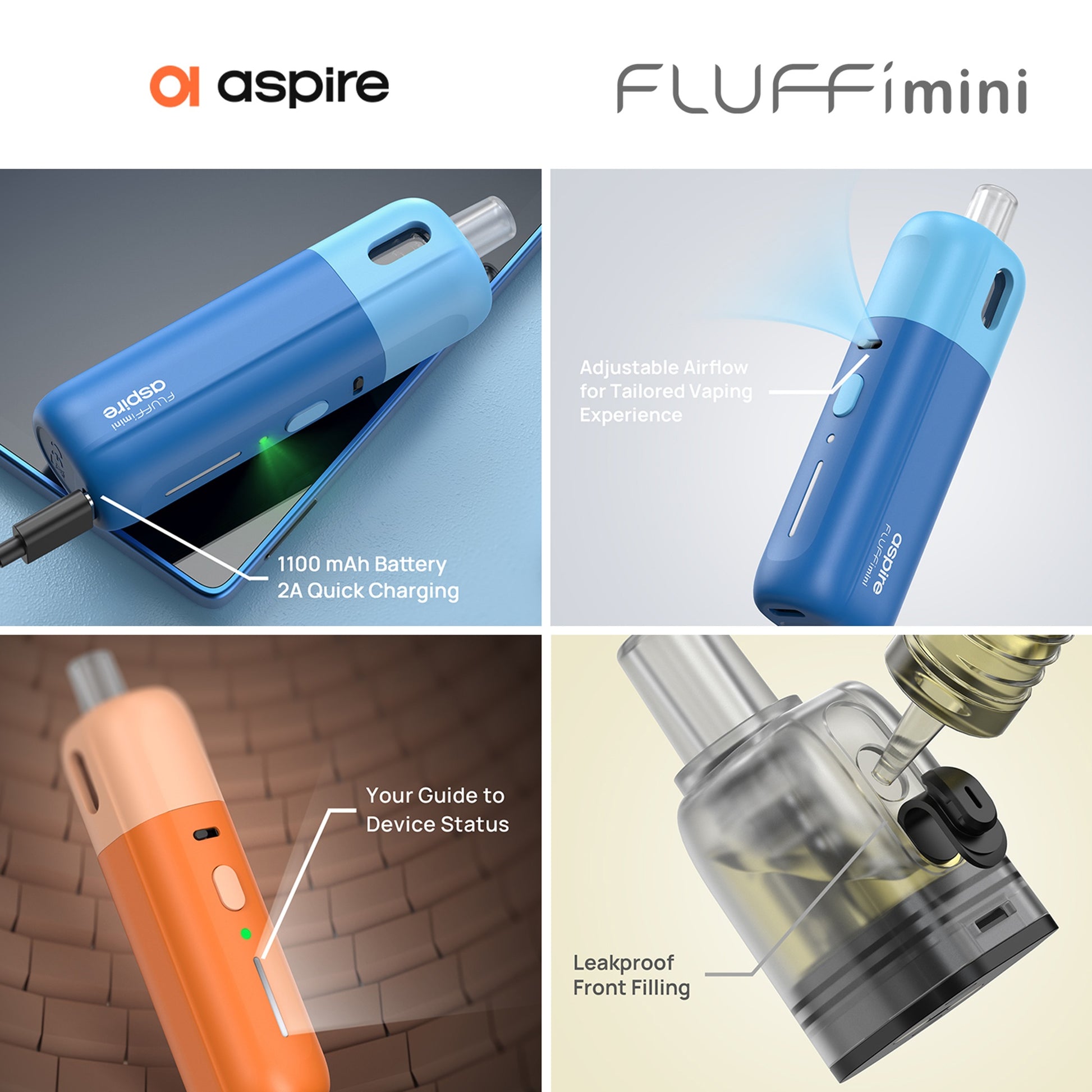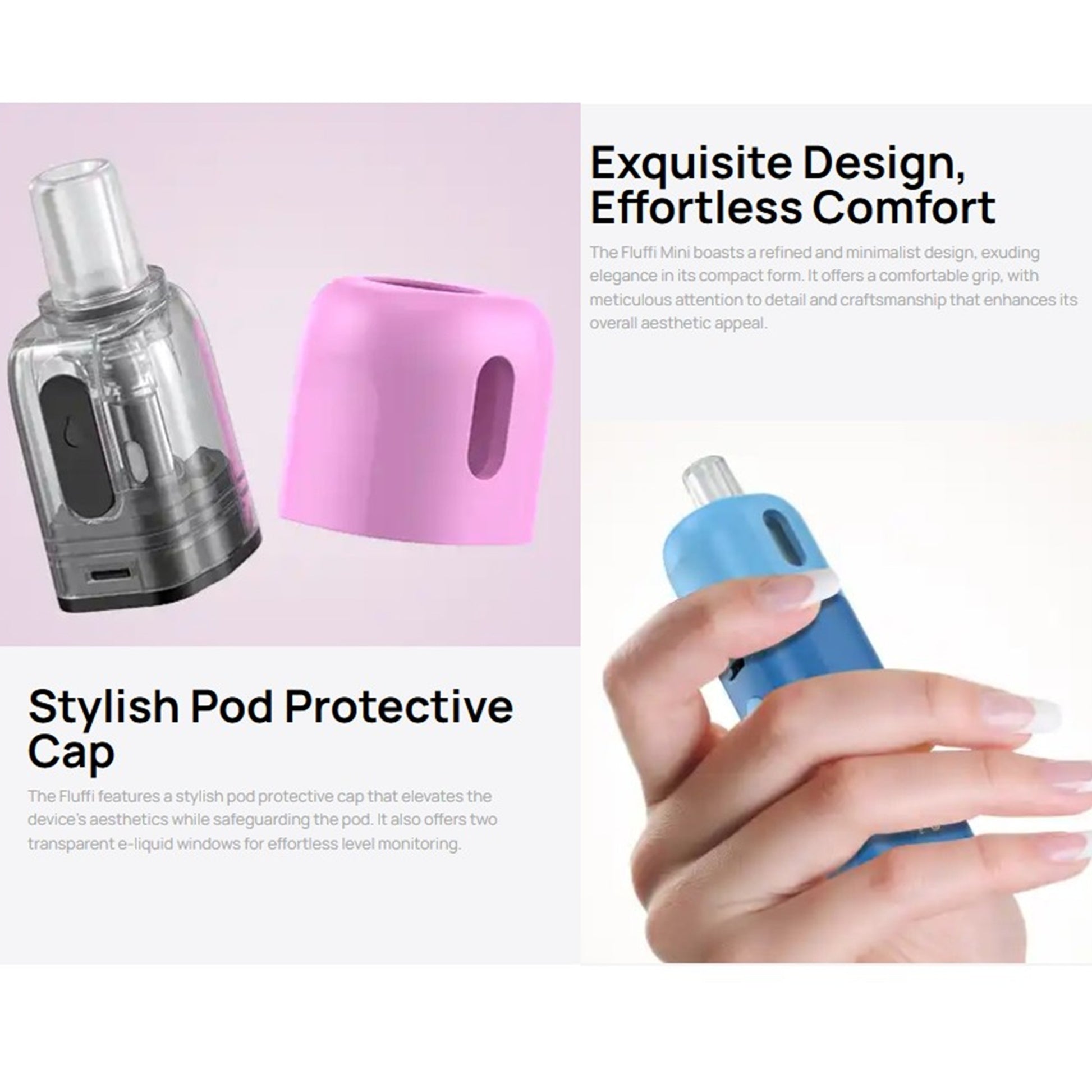 Présentée en boite imprimée : contenant 1 x Pod Fluffi Mini, 1 x cartouche 0.6Ω 3,5 ml (préinstallée), 1 x cartouche 1.0Ω 3,5 ml, 1 x Drip Tip (Noir), 1 x câble USB-C 1 x manuel d'utilisation.