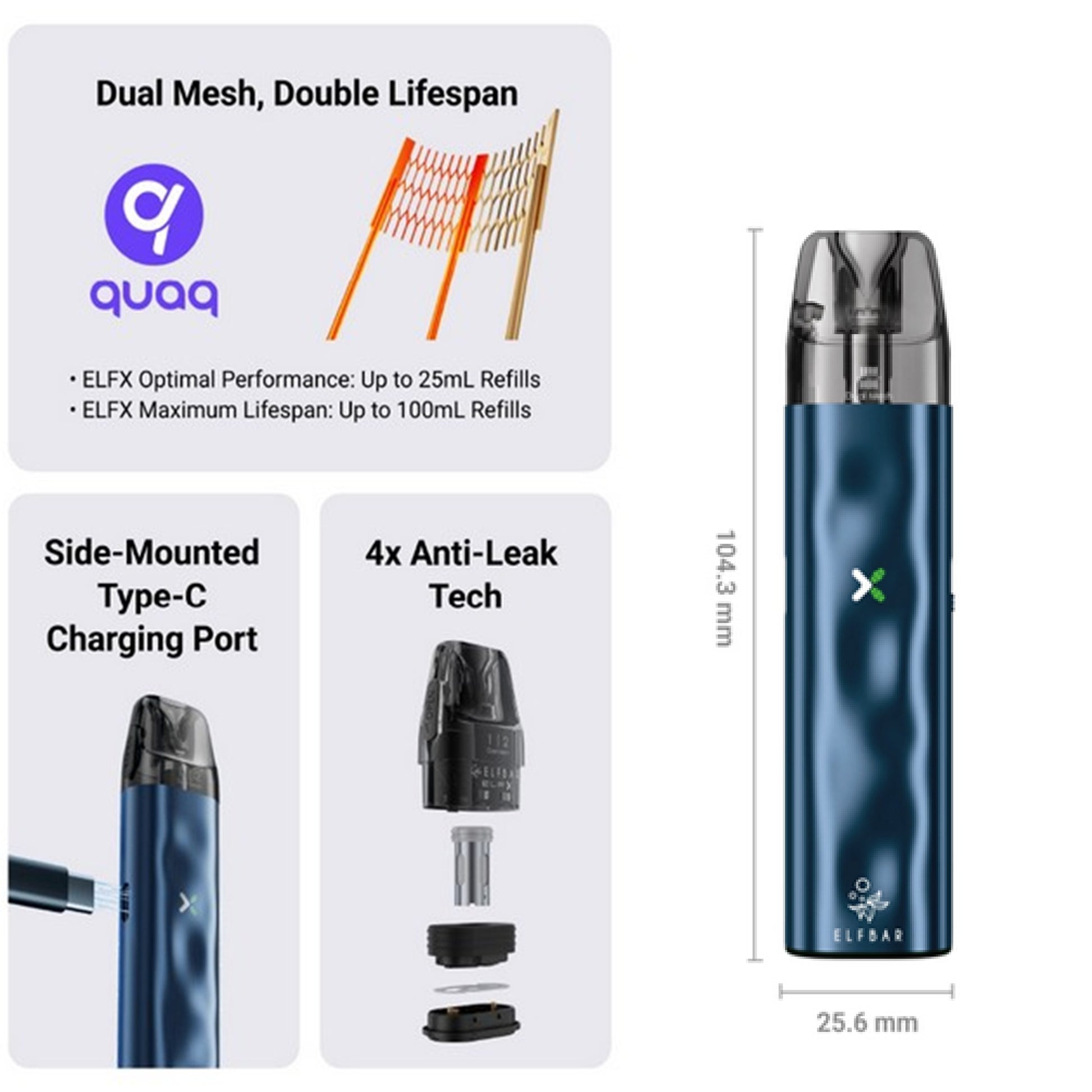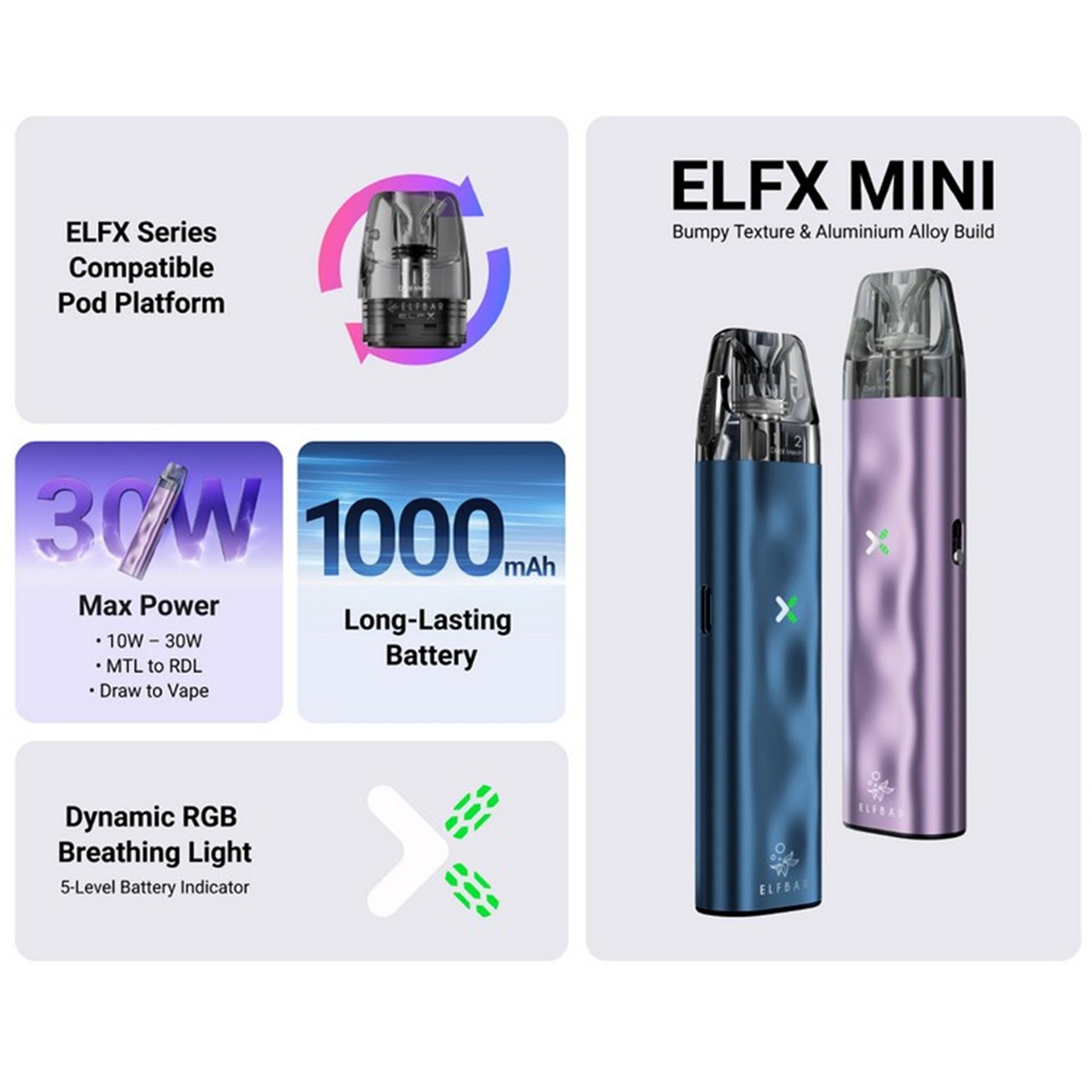 L’ELFBAR ELFX Mini est une e-cig compacte, automatique et puissante, offrant jusqu’à 30 W pour une vape savoureuse en MTL ou RDL. Sa batterie 1000 mAh assure une belle autonomie et se recharge entièrement en moins de 40 minutes via USB-C.